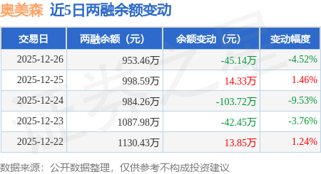 证券之星消息,12月26日,奥美森(920080)融资买入4.72万元,融资偿还49.86万元,融资净卖出45.14万元,融资余额953.46万元。