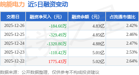 证券之星消息,12月26日,皖能电力(000543)融资买入4667.09万元,融资偿还4851.69万元,融资净卖出184.6万元,融资余额4.83亿元。