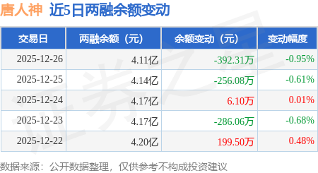 证券之星消息,12月26日,唐人神(002567)融资买入592.92万元,融资偿还985.69万元,融资净卖出392.77万元,融资余额4.1亿元,近20个交易日中有11个交易日出现融资净买入。