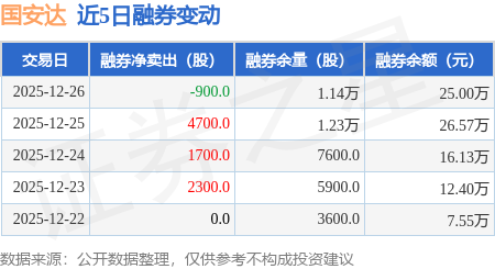 证券之星消息,12月26日,国安达(300902)融资买入1409.04万元,融资偿还1845.53万元,融资净卖出436.48万元,融资余额1.6亿元,近20个交易日中有11个交易日出现融资净买入。