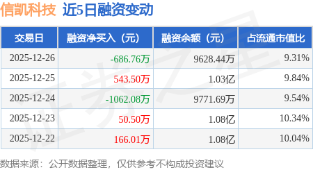 证券之星消息,12月26日,信凯科技(001335)融资买入289.75万元,融资偿还976.51万元,融资净卖出686.76万元,融资余额9628.44万元。