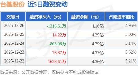 证券之星消息,12月26日,台基股份(300046)融资买入3122.82万元,融资偿还4439.43万元,融资净卖出1316.61万元,融资余额4.16亿元。