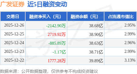 证券之星消息,12月26日,广发证券(000776)融资买入2.3亿元,融资偿还2.51亿元,融资净卖出2142.9万元,融资余额38.68亿元。