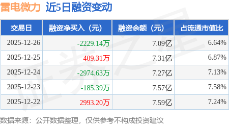 证券之星消息,12月26日,雷电微力(301050)融资买入1.07亿元,融资偿还1.29亿元,融资净卖出2229.14万元,融资余额7.09亿元,近20个交易日中有11个交易日出现融资净买入。