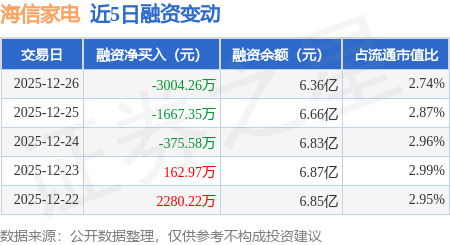 证券之星消息,12月26日,海信家电(000921)融资买入748.44万元,融资偿还3752.7万元,融资净卖出3004.26万元,融资余额6.36亿元。