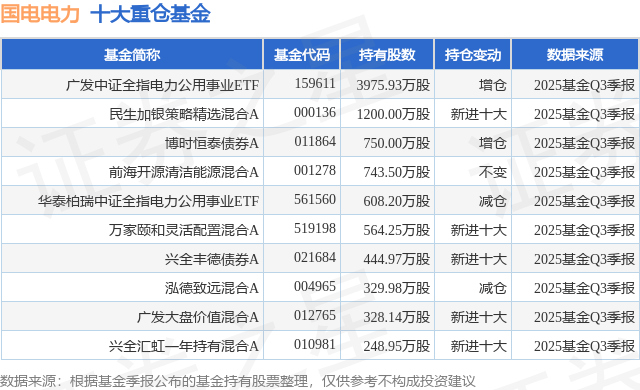 重仓国电电力的前十大公募基金请见下表: