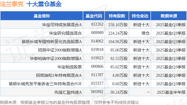 根据2025基金Q3季报公募基金重仓股数据,重仓该股的公募基金共8家,其中持有数量最多的公募基金为华宝基金的华宝可持续发展混合A。华宝可持续发展混合A目前规模为5.12亿元,最新净值1.1103(12月26日),较上一交易日下跌0.15%,近一年上涨36.77%。该公募基金现任基金经理为贺喆。贺喆在任的基金产品包括:华宝制造股票,管理时间为2018年8月24日至今,期间收益率为176.94%;华宝研究精选混合,管理时间为2021年12月21日至今,期间收益率为6.85%。
