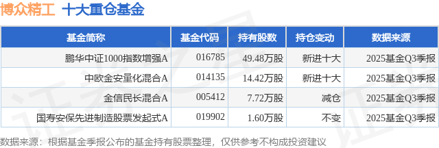 根据2025基金Q3季报公募基金重仓股数据,重仓该股的公募基金共4家,其中持有数量最多的公募基金为鹏华基金的鹏华中证1000指数增强A。鹏华中证1000指数增强A目前规模为10.95亿元,最新净值1.5724(12月26日),较上一交易日上涨0.01%,近一年上涨41.0%。该公募基金现任基金经理为苏俊杰 时赟超。苏俊杰在任的基金产品包括:鹏华沪深300指数增强A,管理时间为2021年3月5日至今,期间收益率为12.79%;鹏华中证500指数增强A,管理时间为2022年1月11日至今,期间收益率为47.19%;鹏华沪深300ETF联接(LOF)A,管理时间为2022年8月3日至今,期间收益率为18.62%;鹏华上证科创板50成份增强策略ETF,管理时间为2022年12月1日至今,期间收益率为60.21%。时赟超在任的基金产品包括:鹏华量化先锋混合,管理时间为2024年12月28日至今,期间收益率为34.6%;鹏华智投800混合A,管理时间为2024年12月28日至今,期间收益率为21.79%;鹏华安泽混合A,管理时间为2025年4月30日至今,期间收益率为1.15%。