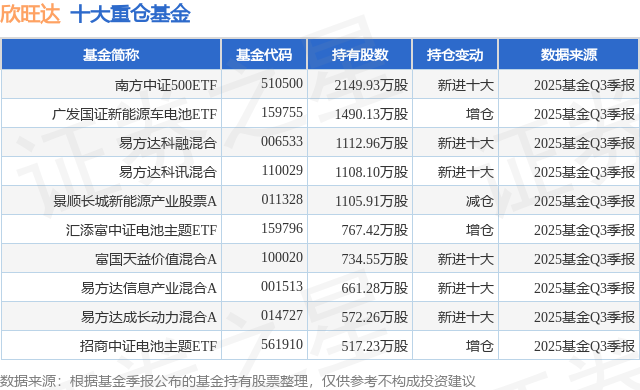 根据2025基金Q3季报公募基金重仓股数据,重仓该股的公募基金共124家,其中持有数量最多的公募基金为南方基金的南方中证500ETF。南方中证500ETF目前规模为400.98亿元,最新净值7.5837(12月26日),较上一交易日上涨0.65%,近一年上涨28.89%。该公募基金现任基金经理为罗文杰。罗文杰在任的基金产品包括:南方中证500ETF联接(LOF)A,管理时间为2013年4月22日至今,期间收益率为149.35%;南方沪深300ETF,管理时间为2013年5月17日至今,期间收益率为153.79%;南方沪深300ETF联接A,管理时间为2013年5月17日至今,期间收益率为139.15%。