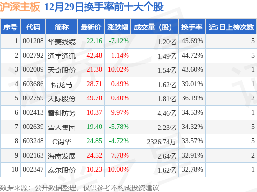 当日沪深主板换手率前10大个股中7只个股收涨,平均涨幅5.69%,其中华菱线缆(001208)以换手率45.69%排第一,6只个股近5个交易日中多次上榜。