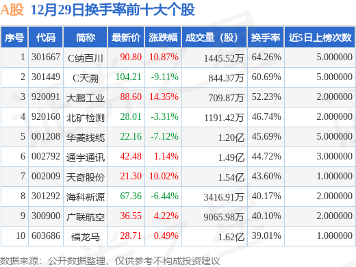 当日A股换手率前10大个股中6只个股收涨,平均涨幅6.85%,其中C纳百川(301667)以换手率64.26%排第一,8只个股近5个交易日中多次上榜。