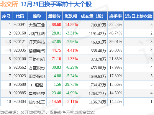 当日北交所换手率前10大个股中4只个股收涨,平均涨幅5.8%,其中大鹏工业(920091)以换手率52.23%排第一,9只个股近5个交易日中多次上榜。