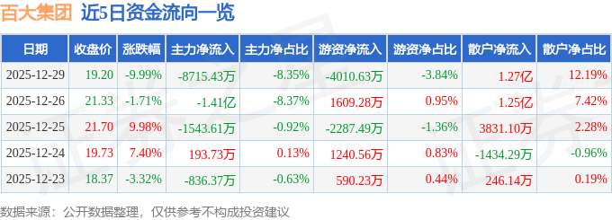 证券之星消息,截至2025年12月29日收盘,百大集团(600865)报收于19.2元,下跌9.99%,跌停,换手率14.24%,成交量53.58万手,成交额10.44亿元。