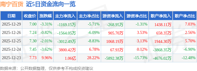 证券之星消息,截至2025年12月29日收盘,南宁百货(600712)报收于7.0元,下跌3.31%,换手率5.39%,成交量29.03万手,成交额2.05亿元。