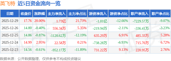 证券之星消息,截至2025年12月29日收盘,英飞特(300582)报收于17.76元,上涨20.0%,涨停,换手率21.49%,成交量47.61万手,成交额7.97亿元。