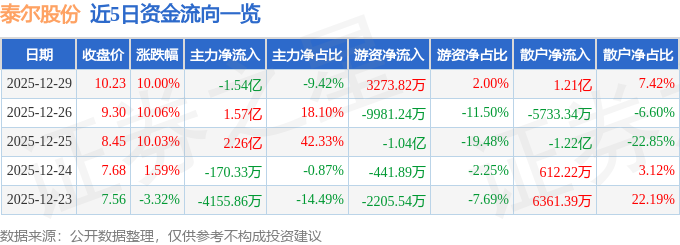 证券之星消息,截至2025年12月29日收盘,泰尔股份(002347)报收于10.23元,上涨10.0%,已连续涨停3天,换手率32.78%,成交量161.71万手,成交额16.38亿元。