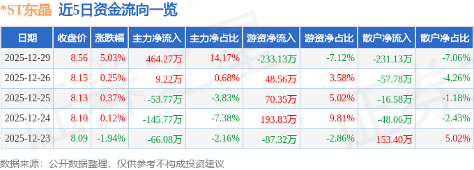 证券之星消息,截至2025年12月29日收盘,*ST东晶(002199)报收于8.56元,上涨5.03%,换手率1.6%,成交量3.9万手,成交额3275.91万元。