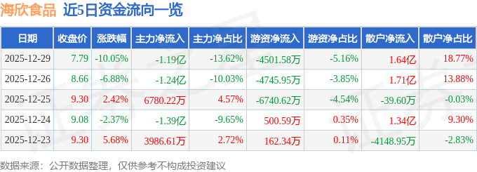 证券之星消息,截至2025年12月29日收盘,海欣食品(002702)报收于7.79元,下跌10.05%,跌停,换手率23.81%,成交量109.23万手,成交额8.73亿元。