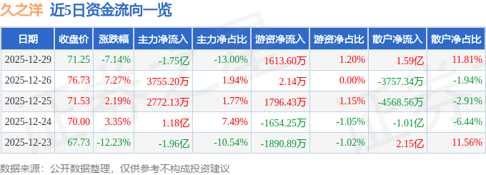 证券之星消息,截至2025年12月29日收盘,久之洋(300516)报收于71.25元,下跌7.14%,换手率10.35%,成交量18.64万手,成交额13.48亿元。