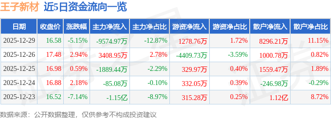 证券之星消息,截至2025年12月29日收盘,王子新材(002735)报收于16.58元,下跌5.15%,换手率15.82%,成交量44.38万手,成交额7.44亿元。
