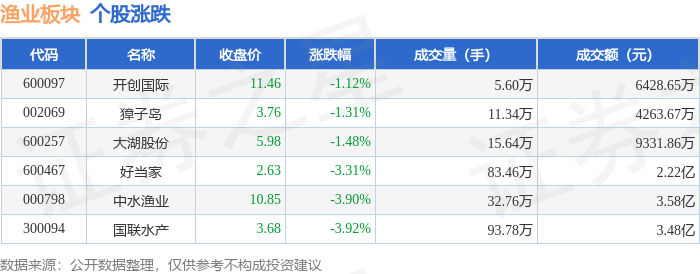 证券之星消息,12月29日渔业板块较上一交易日下跌2.74%,国联水产领跌。当日上证指数报收于3965.28,上涨0.04%。深证成指报收于13537.1,下跌0.49%。渔业板块个股涨跌见下表: