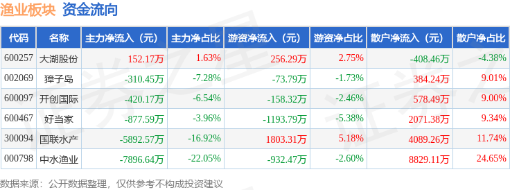 从资金流向上来看,当日渔业板块主力资金净流出1.52亿元,游资资金净流出298.76万元,散户资金净流入1.55亿元。渔业板块个股资金流向见下表:
