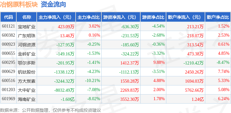 从资金流向上来看,当日冶钢原料板块主力资金净流出2.87亿元,游资资金净流入6295.0万元,散户资金净流入2.24亿元。冶钢原料板块个股资金流向见下表: