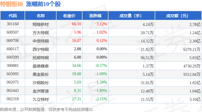 从资金流向上来看,当日特钢板块主力资金净流出3.03亿元,游资资金净流入1148.09万元,散户资金净流入2.92亿元。特钢板块个股资金流向见下表: