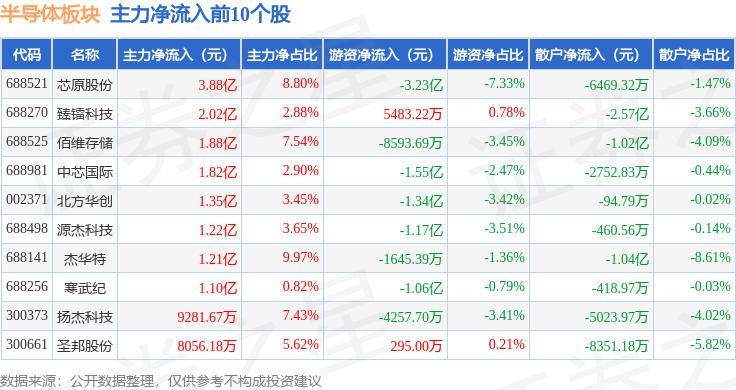 从资金流向上来看,当日半导体板块主力资金净流出44.58亿元,游资资金净流入5.3亿元,散户资金净流入39.29亿元。半导体板块个股资金流向见下表: