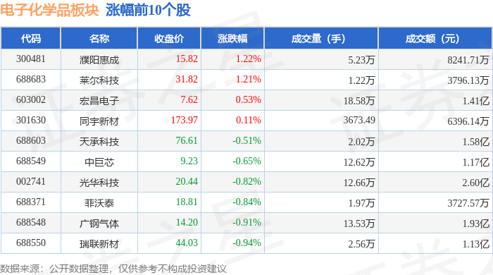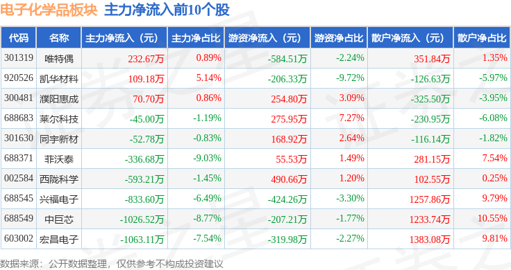 从资金流向上来看,当日电子化学品板块主力资金净流出22.13亿元,游资资金净流入3.68亿元,散户资金净流入18.46亿元。电子化学品板块个股资金流向见下表: