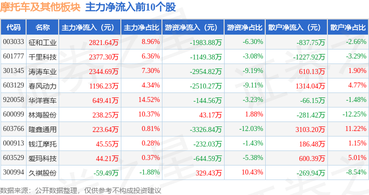 从资金流向上来看,当日摩托车及其他板块主力资金净流出6904.39万元,游资资金净流出6061.57万元,散户资金净流入1.3亿元。摩托车及其他板块个股资金流向见下表: