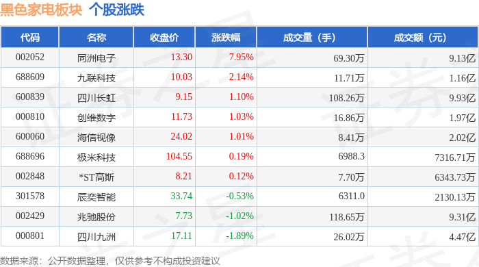 从资金流向上来看,当日黑色家电板块主力资金净流入4212.99万元,游资资金净流出4627.57万元,散户资金净流入414.58万元。黑色家电板块个股资金流向见下表:
