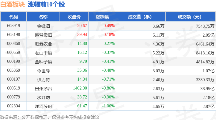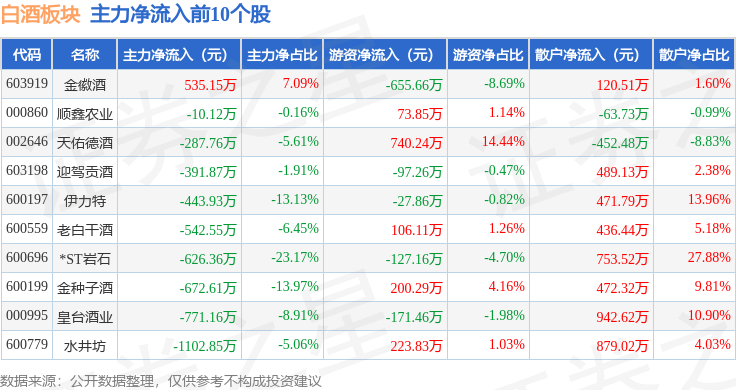 从资金流向上来看,当日白酒板块主力资金净流出12.85亿元,游资资金净流入4.19亿元,散户资金净流入8.66亿元。白酒板块个股资金流向见下表: