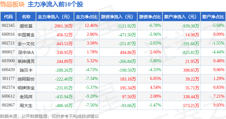 从资金流向上来看,当日饰品板块主力资金净流出2300.14万元,游资资金净流出694.09万元,散户资金净流入2994.23万元。饰品板块个股资金流向见下表:
