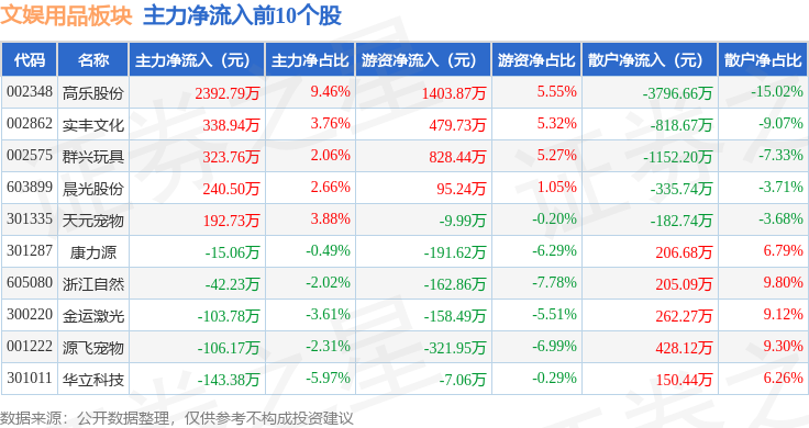 从资金流向上来看,当日文娱用品板块主力资金净流出1.15亿元,游资资金净流入2200.45万元,散户资金净流入9320.6万元。文娱用品板块个股资金流向见下表: