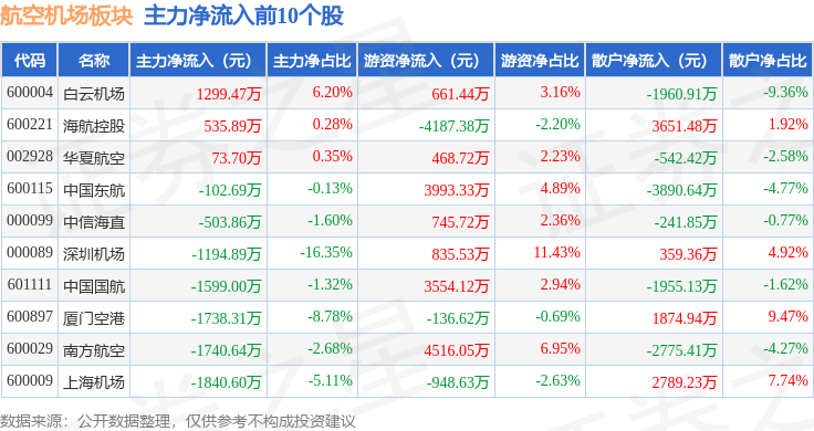 从资金流向上来看,当日航空机场板块主力资金净流出1.4亿元,游资资金净流入1.23亿元,散户资金净流入1680.81万元。航空机场板块个股资金流向见下表: