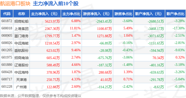 从资金流向上来看,当日航运港口板块主力资金净流出5.63亿元,游资资金净流入1.26亿元,散户资金净流入4.37亿元。航运港口板块个股资金流向见下表: