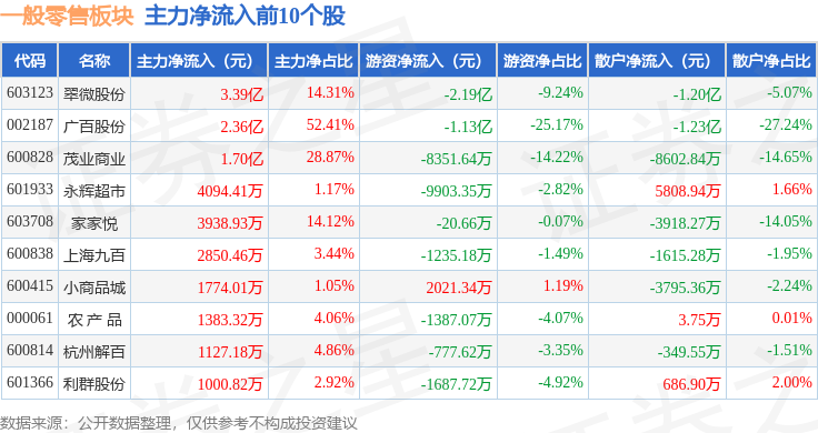 从资金流向上来看,当日一般零售板块主力资金净流出14.22亿元,游资资金净流出3.38亿元,散户资金净流入17.6亿元。一般零售板块个股资金流向见下表: