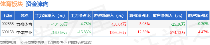 从资金流向上来看,当日体育板块主力资金净流出2565.37万元,游资资金净流入2016.6万元,散户资金净流入548.77万元。体育板块个股资金流向见下表: