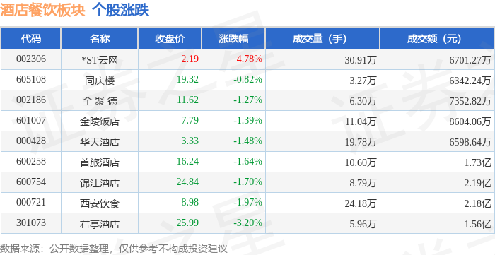 证券之星消息,12月29日酒店餐饮板块较上一交易日下跌1.53%,君亭酒店领跌。当日上证指数报收于3965.28,上涨0.04%。深证成指报收于13537.1,下跌0.49%。酒店餐饮板块个股涨跌见下表: