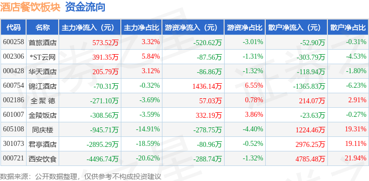 从资金流向上来看,当日酒店餐饮板块主力资金净流出7817.05万元,游资资金净流入481.87万元,散户资金净流入7335.18万元。酒店餐饮板块个股资金流向见下表: