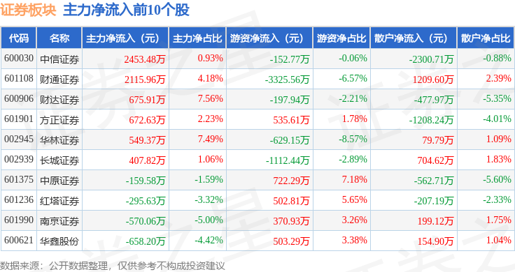 从资金流向上来看,当日证券板块主力资金净流出28.01亿元,游资资金净流入10.08亿元,散户资金净流入17.94亿元。证券板块个股资金流向见下表: