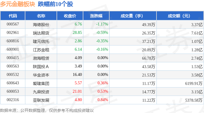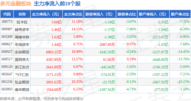 从资金流向上来看,当日多元金融板块主力资金净流入10.69亿元,游资资金净流出3.96亿元,散户资金净流出6.73亿元。多元金融板块个股资金流向见下表: