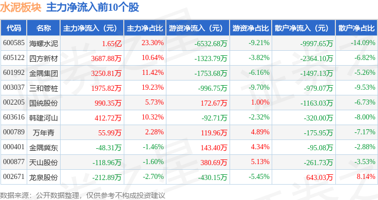 从资金流向上来看,当日水泥板块主力资金净流出2256.86万元,游资资金净流出1.43亿元,散户资金净流入1.65亿元。水泥板块个股资金流向见下表: