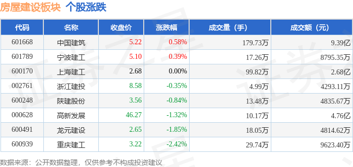 证券之星消息,12月29日房屋建设板块较上一交易日上涨0.27%,中国建筑领涨。当日上证指数报收于3965.28,上涨0.04%。深证成指报收于13537.1,下跌0.49%。房屋建设板块个股涨跌见下表: