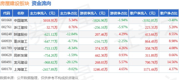 从资金流向上来看,当日房屋建设板块主力资金净流出1091.22万元,游资资金净流入238.88万元,散户资金净流入852.35万元。房屋建设板块个股资金流向见下表: