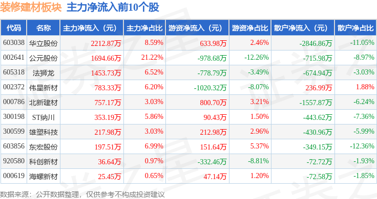 从资金流向上来看,当日装修建材板块主力资金净流出1.78亿元,游资资金净流入8871.01万元,散户资金净流入8927.52万元。装修建材板块个股资金流向见下表: