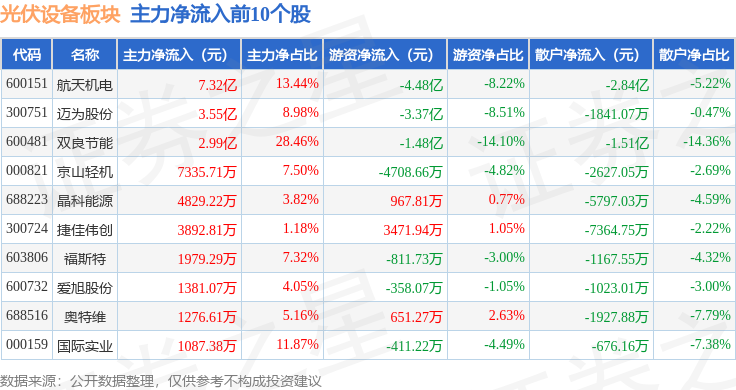 从资金流向上来看,当日光伏设备板块主力资金净流出18.95亿元,游资资金净流出1.57亿元,散户资金净流入20.52亿元。光伏设备板块个股资金流向见下表: