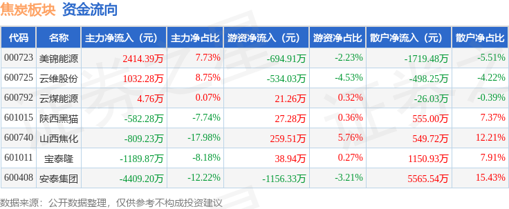 从资金流向上来看,当日焦炭板块主力资金净流出3539.15万元,游资资金净流出2038.29万元,散户资金净流入5577.44万元。焦炭板块个股资金流向见下表: