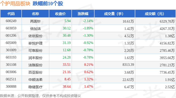 从资金流向上来看,当日个护用品板块主力资金净流出912.25万元,游资资金净流出874.97万元,散户资金净流入1787.21万元。个护用品板块个股资金流向见下表:
